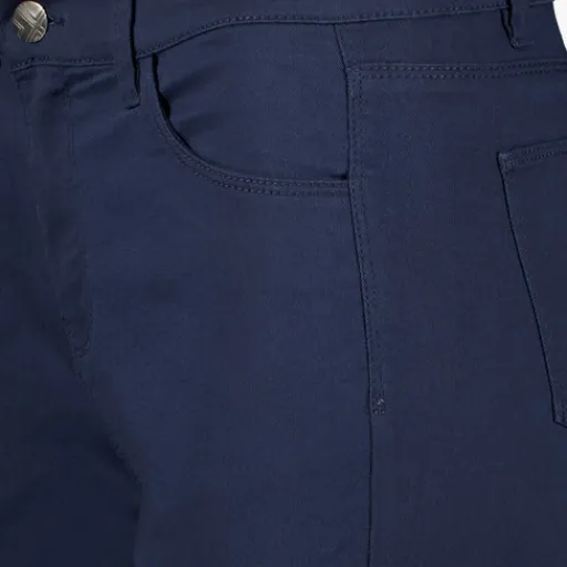 Donkerblauwe capri broek voor dames. Voorzien van een knoop- en ritssluiting, riemlusjes en twee voor- en achterzakken. De capri broek is gemaakt van 70% katoen, 28% polyester en 2% elastaan.
