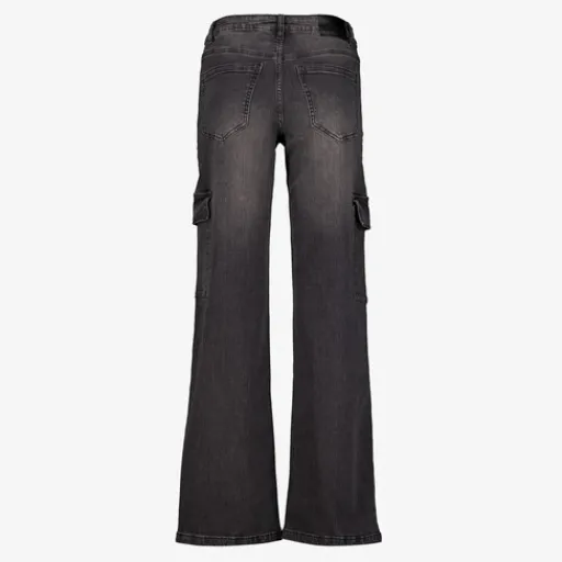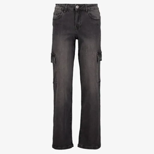 Donkergrijze cargo jeans voor dames van TwoDay. Voorzien van een knoop- en ritssluiting, riemlusjes, twee voor- en achterzakken. De broek heeft kenmerkende zakken met klepjes op de bovenbenen en wijde broekspijpen. Gemaakt van 99% katoen en 1% elastaan.