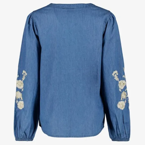 Blauwe denim blouse voor dames van TwoDay. Voorzien van een V-hals met strikkoordjes en lange mouwen met elastiek. De blouse heeft geborduurde bloemen op de mouwen en de kraag. Gemaakt van 100% katoen.