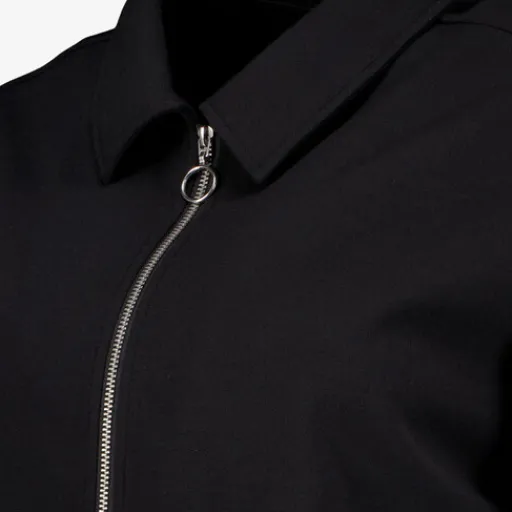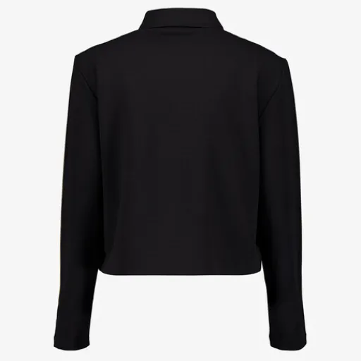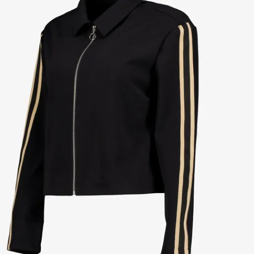 Zwarte TwoDay jas met een sportieve uitstraling voor dames. De jas heeft een omgeslagen kraag, een ritssluiting en beige strepen langs de armen. Gemaakt van 100% polyester. Combineer de jas met de bijbehorende broek en maak je outfit compleet!