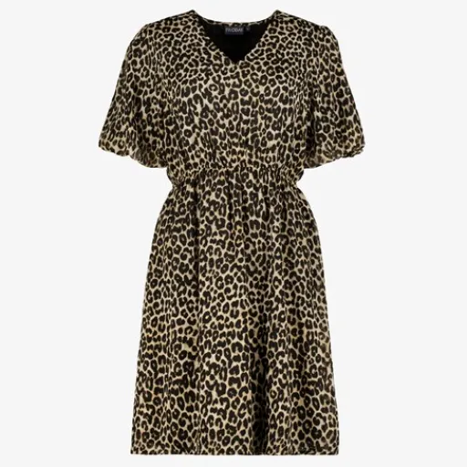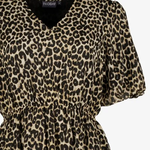 Beige jurk met panterprint voor dames van TwoDay. Voorzien van een V-hals, korte mouwen en elastiek in de taille. Gemaakt van 100% polyester.