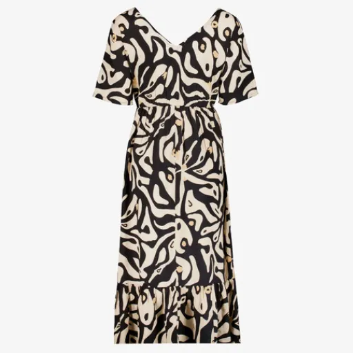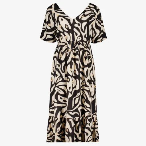 Beige-zwarte midi jurk met print voor dames uit de TwoDay collectie. Voorzien van een V-hals, korte mouwen en elastiek in de taille. De jurk heeft V-uitsnijding aan de achterkant en is gemaakt van 100% viscose.