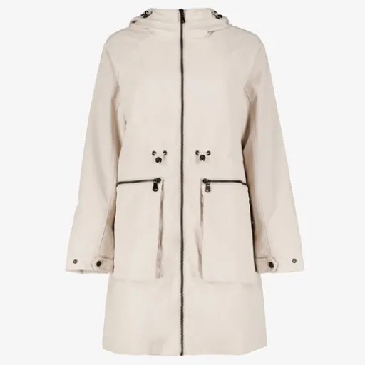 Lichtgrijze parka jas voor dames. Voorzien van een ritssluiting, hoge kraag en vaste capuchon met aantrekkoordjes. De jas heeft verstelbare mouwen met drukknopen en twee grote zakken met ritsen. De parka is aan te snoeren in de taille. Gemaakt van 100% polyester.