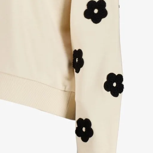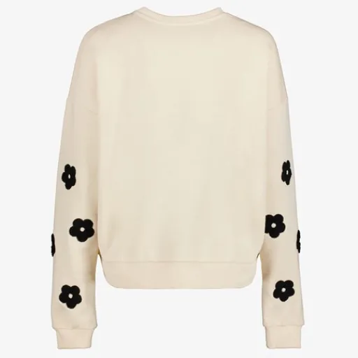 Beige sweater voor dames. Voorzien van lange mouwen, een ronde hals en elastische boorden. De sweater heeft geborduurde bloemen op de mouwen en is gemaakt van 65% katoen en 35% polyester.