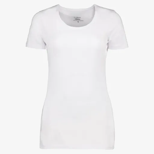Wit basic T-shirt voor dames. Voorzien van korte mouwen en een ronde hals. Het T-shirt heeft een comfortabele, slimfit pasvorm en is gemaakt van 95% katoen en 5% elastaan.