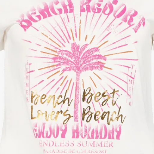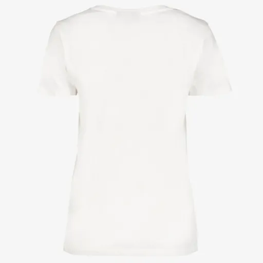 Wit T-shirt voor dames. Voorzien van korte mouwen en een ronde hals. Het T-shirt heeft een roze met goudkleurige print en tekst aan de voorzijde. Gemaakt van 100% katoen.