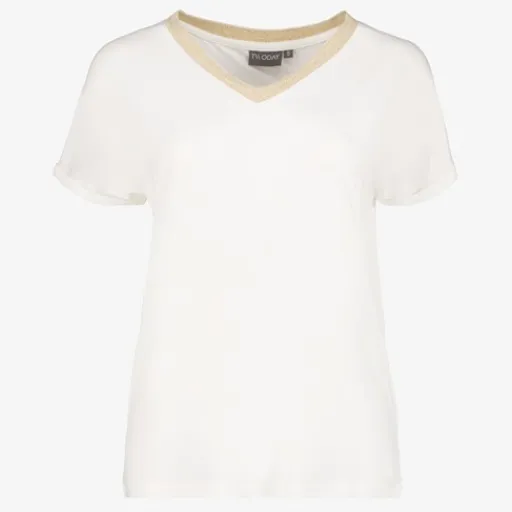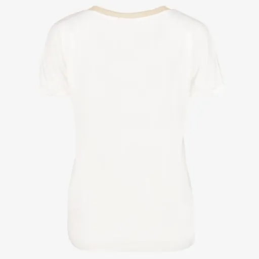 Wit dames T-shirt van TwoDay. Voorzien van een V-hals en korte mouwen. Het shirt heeft een beige halslijn met subtiele goudkleurige glitters. Gemaakt van 95% viscose en 5% elastaan.