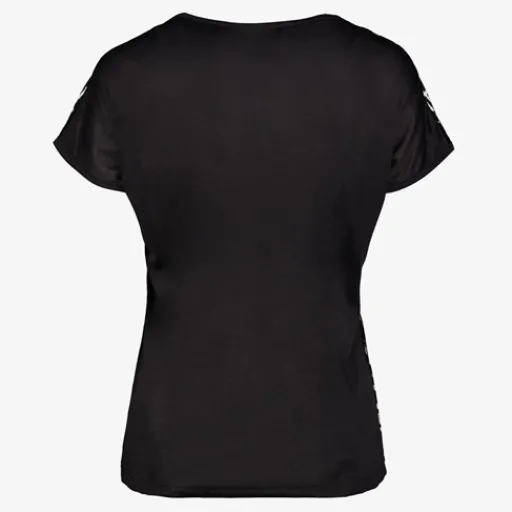 Zwarte top voor dames. Voorzien van korte mouwen en een ronde hals. Het T-shirt heeft een witte, grafische print aan de voorzijde. Gemaakt van 100% crepe polyester.