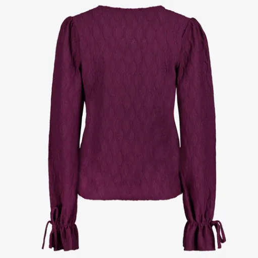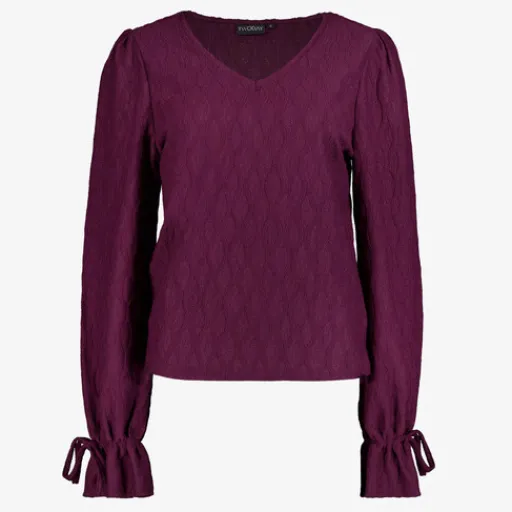 Donkerpaarse top voor dames uit de TwoDay collectie. Voorzien van een V-hals, lange mouwen met strikkoordjes bij de polsen en een structuur in de stof. De top is gemaakt van 98% polyester en 2% elastaan.
