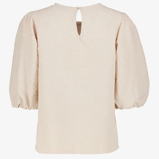 Beige top met pofmouwen voor dames uit de TwoDay collectie. Voorzien van een ronde hals en een knoopsluiting aan de achterzijde. De top heeft een sierlijke structuur in de stof en is gemaakt van 95% polyester en 5% elastaan.