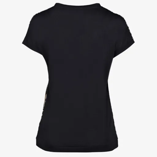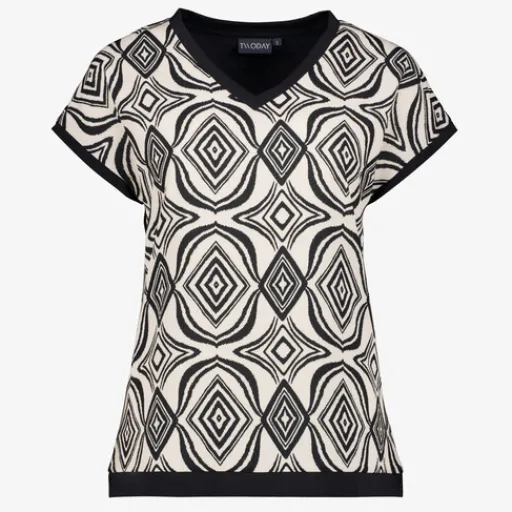 Zwart-witte top voor dames van TwoDay. Voorzien van een V-hals en korte mouwen. De top heeft een grafische print aan de voorzijde en de achterzijde is egaal zwart. Gemaakt van 100% polyester.