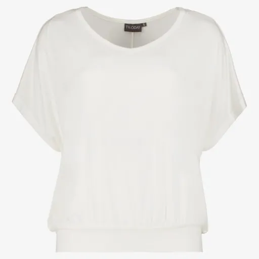 Witte top voor dames. Voorzien van korte vlindermouwen, een wijde ronde hals en elastiek aan de onderzijde. Gemaakt van 95% viscose en 5% elastaan.