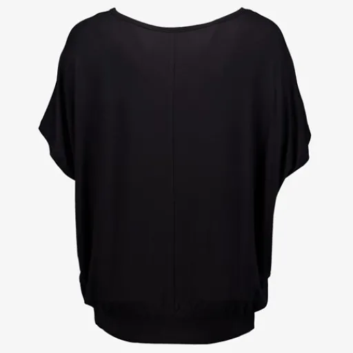 Zwarte top voor dames. Voorzien van een wijde, ronde hals, vlindermouwen en elastiek aan de onderzijde. De top is gemaakt van 95% viscose en 5% elastaan.