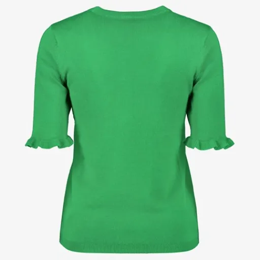 Groen truitje voor dames van TwoDay. Voorzien van halflange mouwen met ruches en een ronde hals. De trui is gemaakt van 70% viscose en 30% polyester.