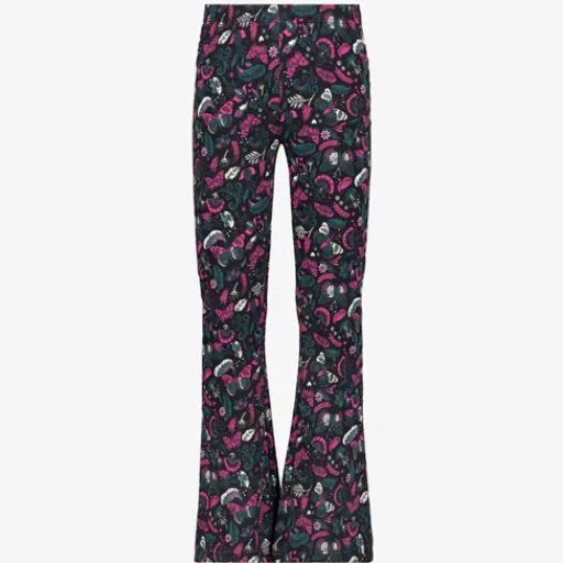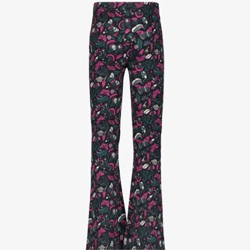 Zwarte flared broek met een all over print voor meisjes van TwoDay. Voorzien van een elastische tailleband, een aansluitende pasvorm en wijde broekspijpen. De broek heeft een vrolijke print met vlinders, bloemen en bladeren in verschillende kleuren. Gemaakt van 57% katoen, 42% polyester en 1% elastaan.