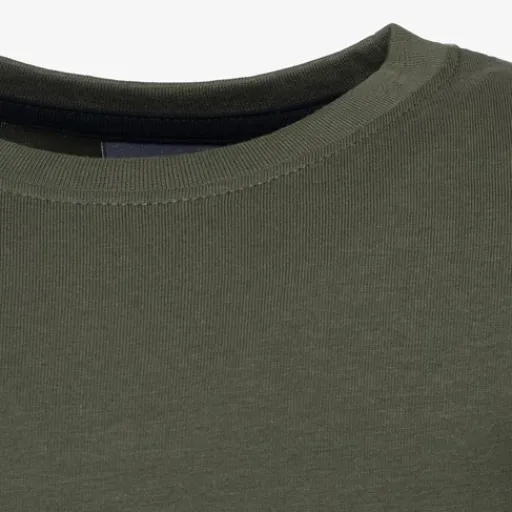 Groen basic T-shirt voor jongens. Voorzien van korte mouwen en een hoge, ronde hals. Het T-shirt is gemaakt van 100% katoen.