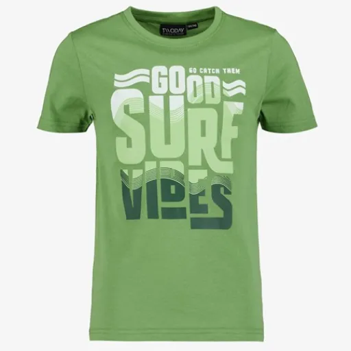 Groen jongens T-shirt met een tekstopdruk op de borst van TwoDay. Voorzien van een ronde hals en korte mouwen. Gemaakt van 100% katoen.
