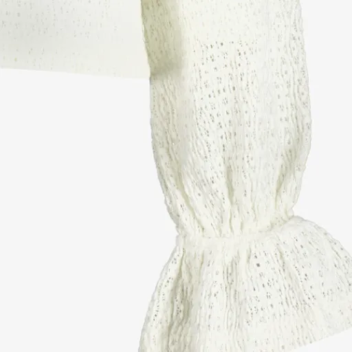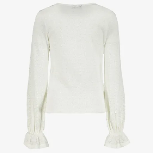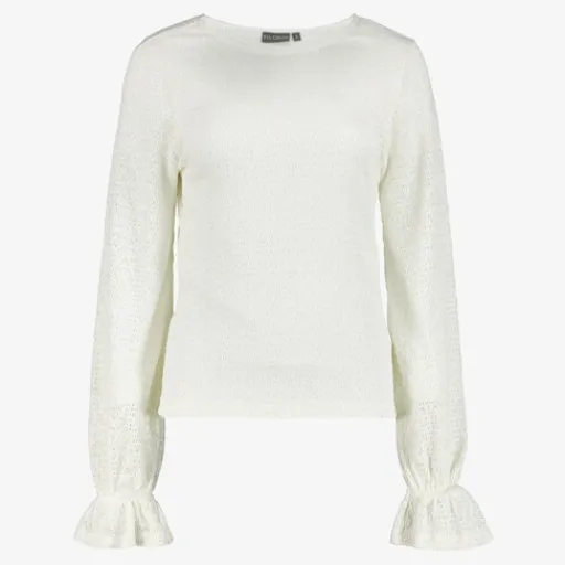 Witte kanten top voor dames uit de TwoDay collectie. Voorzien van een ronde hals en lange mouwen met ruches bij de polsen. Gemaakt van 90% polyester en 10% elastaan.