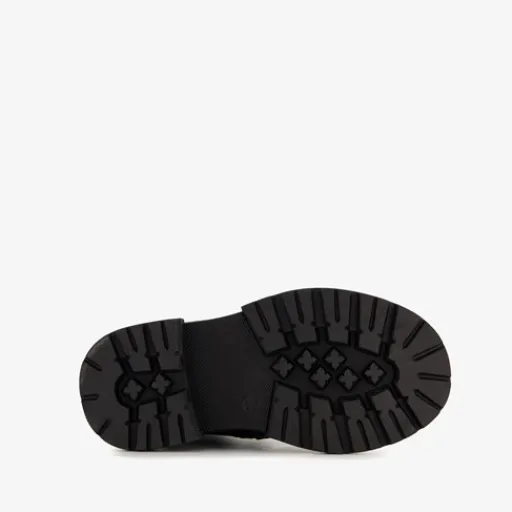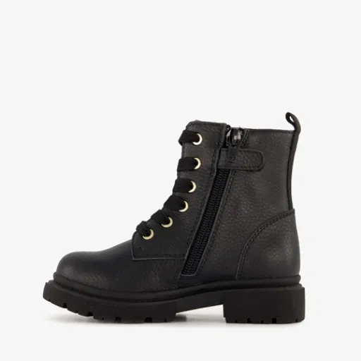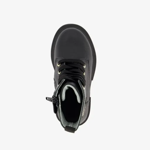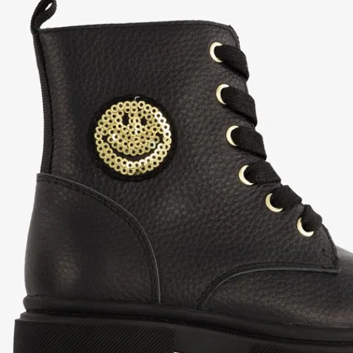 Zwarte boots met goudkleurige smiley voor meisjes van TwoDay. Het buiten- en binnenwerk zijn gemaakt van leer en de stevige zool met profiel van rubber. Voorzien van een vetersluiting en een rits met klittenbandje aan de binnenzijde voor een optimale pasvorm en een aantreklusjes aan de achterzijde voor een makkelijke instap. Het comfortabele voetbed is gemaakt van leer en is niet uitneembaar. Schachthoogte is 10 cm. De veterboots hebben het Dr. Visser keurmerk wat de volgende garanties biedt: goede pasvorm, verstevigde hiel, bovenmateriaal van leer en een buigzame zool.
