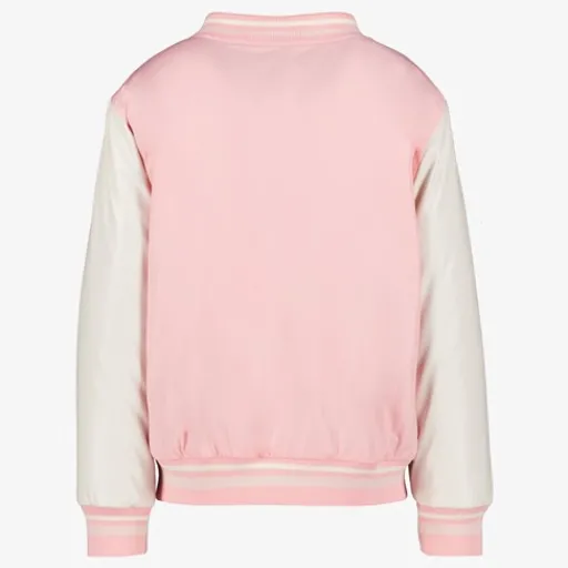 Roze bomberjack voor meisjes van TwoDay. Voorzien van drukknopen, elastische boorden en twee steekzakken. Het bomberjack heeft witte mouwen en een bloem op de borst. Gemaakt van 100% polyester.