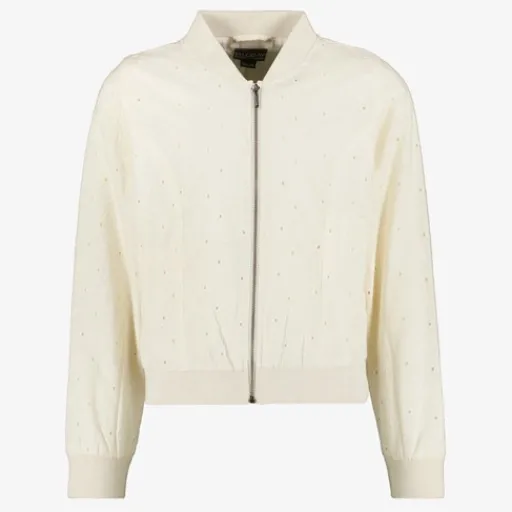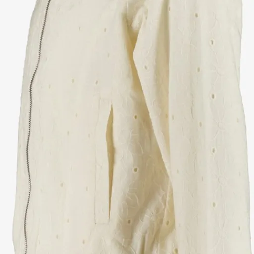 Gebroken wit bomberjack voor meisjes. Voorzien van een ritssluiting, hoge kraag, twee steekzakken en een elastische boord. Het bomberjack heeft broderie details in de stof en is gemaakt van 100% katoen.