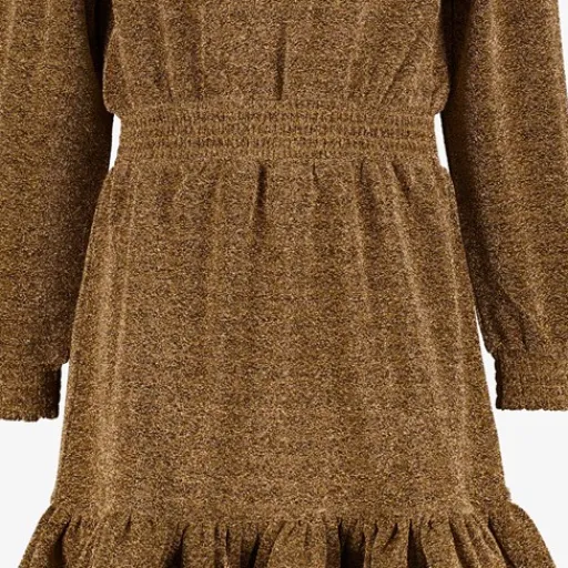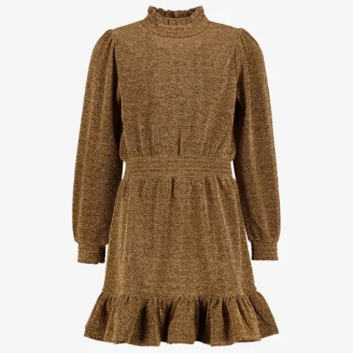 Goudkleurige jurk voor meisjes. Voorzien van lange mouwen met elastiek, een opstaand kraagje en elastiek in de taille. De jurk is middellang van lengte en gemaakt van 98% polyester en 2% metaal.ΒΆΒΆ