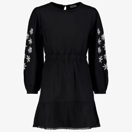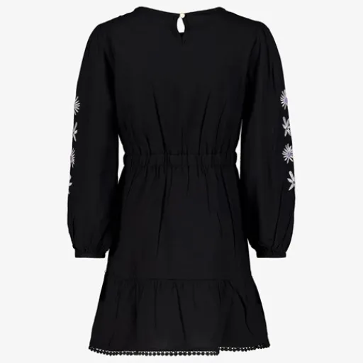 Zwarte jurk voor meisjes uit de TwoDay collectie. Voorzien van een ronde hals met knoopje in de nek, een elastische tailleband en lange mouwen met witte, geborduurde details. Gemaakt van 100% viscose.ΒΆΒΆ