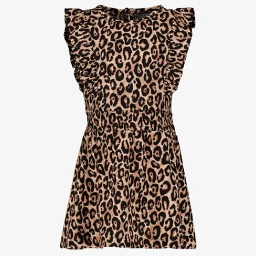Meisjes jurkje met luipaardprint. Voorzien van een ronde hals met een knoopje in de nek, ruches bij de mouwen en elastiek in de taille. Het jurkje heeft all over luipaardprint en is gemaakt van 98% polyester en 2% elastaan.