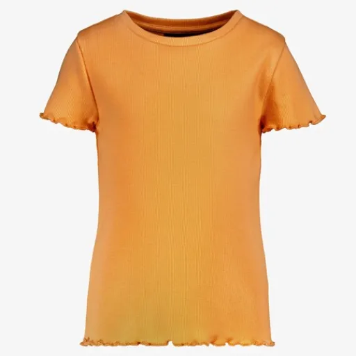 Oranje rib T-shirt voor meisjes. Voorzien van korte mouwen en een ronde hals. Het geribde shirt heeft ruches aan de onderzijde en bij de mouwen. Gemaakt van 95% katoen en 5% elastaan.