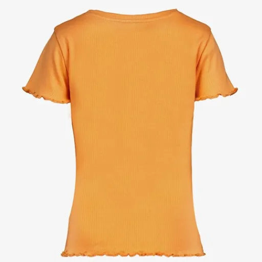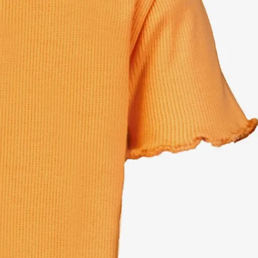 Oranje rib T-shirt voor meisjes. Voorzien van korte mouwen en een ronde hals. Het geribde shirt heeft ruches aan de onderzijde en bij de mouwen. Gemaakt van 95% katoen en 5% elastaan.