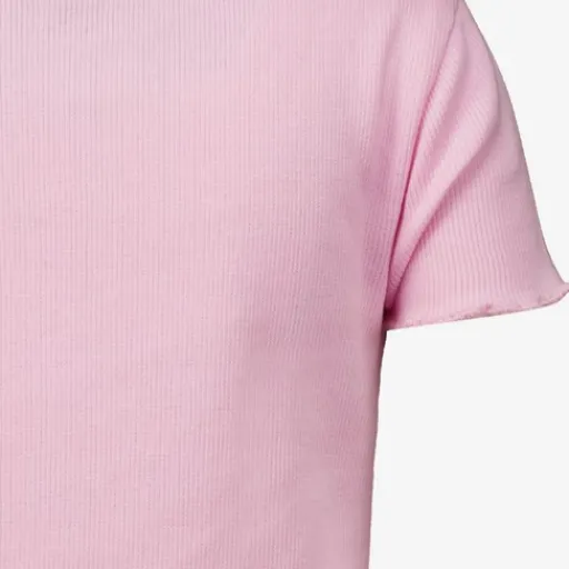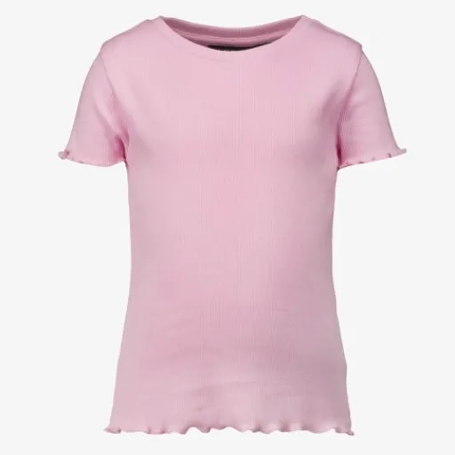 Lichtroze rib T-shirt voor meisjes. Voorzien van korte mouwen en een ronde hals. Het geribde shirt heeft ruches aan de onderzijde en bij de mouwen. Gemaakt van 95% katoen en 5% elastaan.