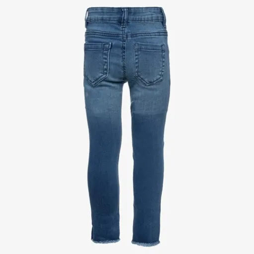 Donkerblauwe skinny jeans voor meisjes. Voorzien van een knoop- en ritssluiting, riemlusjes in de boord en twee voor- en achterzakken. De jeans heeft een aansluitende pasvorm met stretch en subtiele, gebleekte details. Gemaakt van katoen, polyester en elastaan.