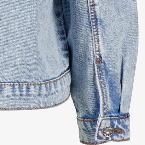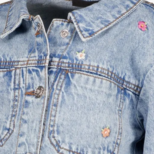 Blauwe spijkerjas voor meisjes. Voorzien van knoopsluitingen, twee borstzakken en knoopjes bij de mouwen. Het denim jack heeft geborduurde bloemetjes en is gemaakt van 100% katoen.