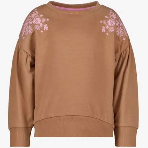 Bruine meisjes sweater uit de TwoDay collectie. Voorzien van een ronde hals en lange mouwen. De trui heeft een roze bloemenprint op de schouders en lage mouwen met elastische boorden. Gemaakt van 100% katoen.