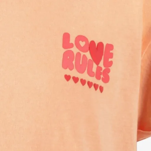 Zalmroze T-shirt voor meiden. Voorzien van korte mouwen, een ronde hals en een grote tekstopdruk op de rug. Gemaakt van 100% katoen.