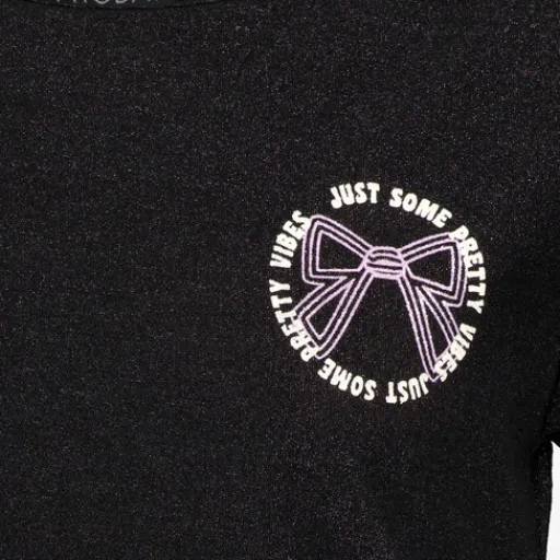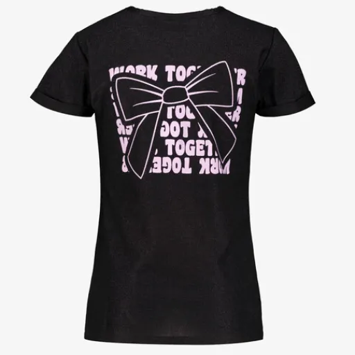 Zwart meisjes T-shirt met backprint van TwoDay. Voorzien van een ronde hals, korte mouwen en een opdruk van een strikje op de borst. Gemaakt van 48% viscose, 31% polyester, 18% lurex en 3% elastaan.