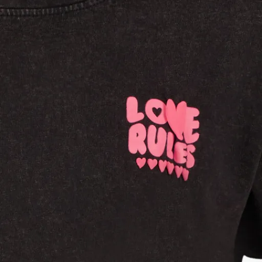 Zwart T-shirt voor meisjes van TwoDay. Voorzien van korte mouwen, een ronde hals en een kleine opdruk op de borst. Op de rug zit een grote, roze tekstopdruk. Gemaakt van 100% katoen.