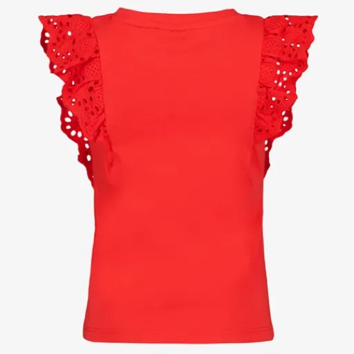 Rood T-shirt voor meisjes. Voorzien van korte mouwen met broderie details en een ronde hals. Het shirt is gemaakt van 100% katoen.