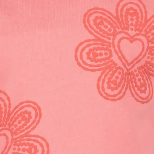 Roze T-shirt voor meisjes. Voorzien van korte mouwen met ruches en een ronde hals. Het shirt heeft geborduurde bloemen aan de voorzijde en is gemaakt van 100% katoen.