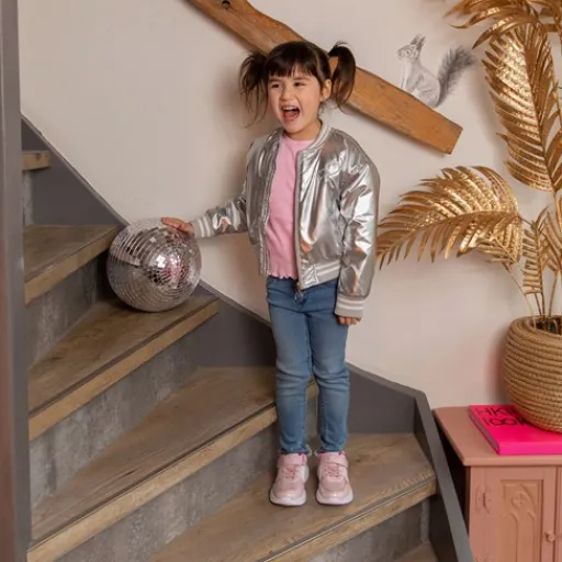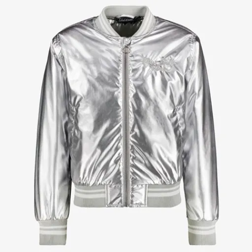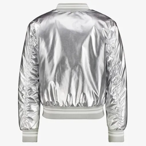 Zilverkleurig bomberjack voor meisjes. Voorzien van een ritssluiting, elastische boorden en twee steekzakken. Het metallic bomberjack is gemaakt van 100% polyester.
