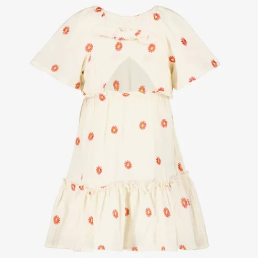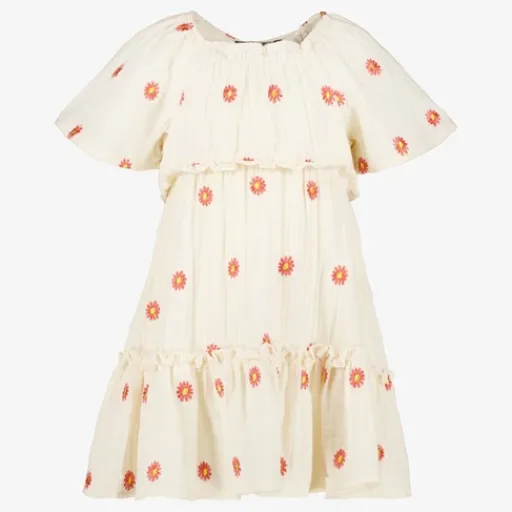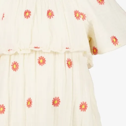 Witte, mousseline jurk voor meisjes. Voorzien van korte mouwen, een strik en opening op de bovenrug en ruches. Het jurkje heeft all over bloemetjesprint en is gemaakt van 100% katoen.