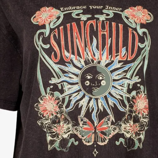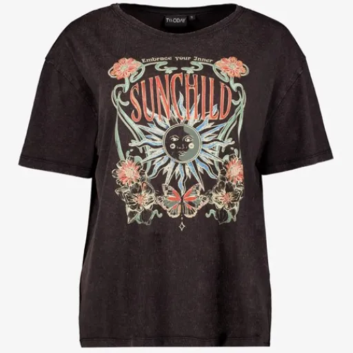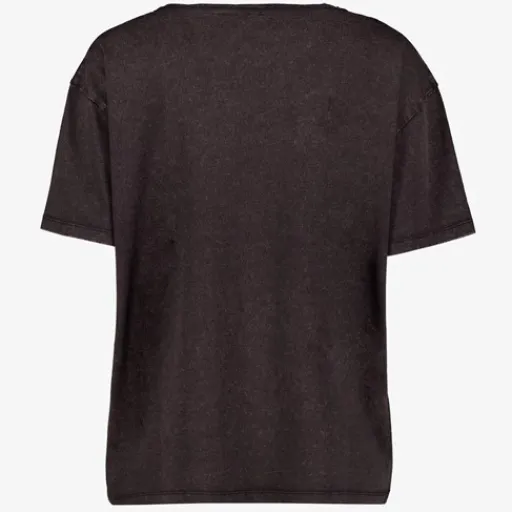 Zwart acid washed T-shirt voor dames. Voorzien van korte mouwen, een ronde hals en een oversized pasvorm. Het T-shirt heeft een grote opdruk aan de voorzijde en is gemaakt van 100% katoen.