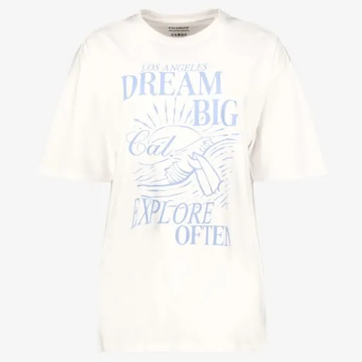 Wit dames T-shirt van TwoDay. Voorzien van korte mouwen, een ronde hals en een blauwe opdruk aan de voorzijde. Gemaakt van 100% katoen.