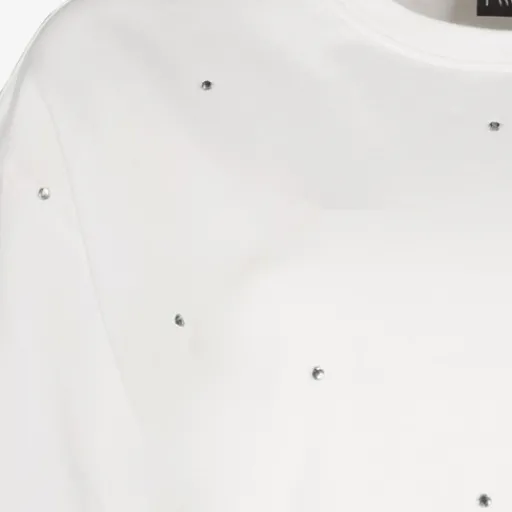Wit, oversized T-shirt voor dames. Voorzien van korte mouwen, een ronde hals en strass-steentjes. Het shirt is gemaakt van 95% katoen en 5% elastaan.