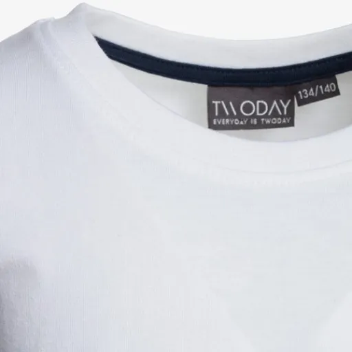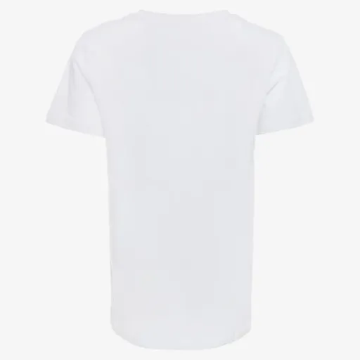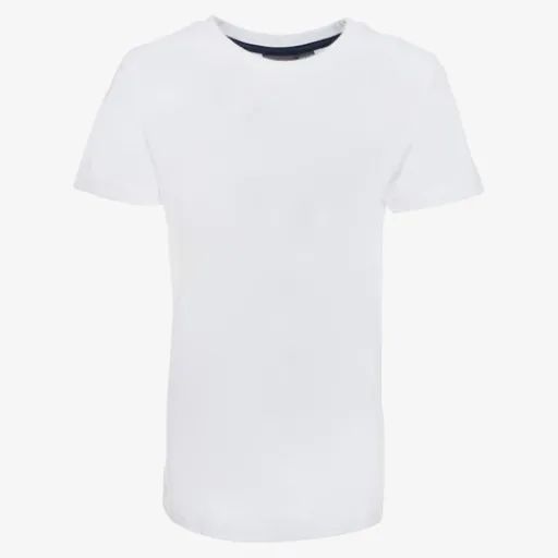 Wit basic T-shirt voor jongens. Voorzien van korte mouwen en een hoge, ronde hals. Het T-shirt heeft een comfortabele pasvorm en is gemaakt van 100% katoen.