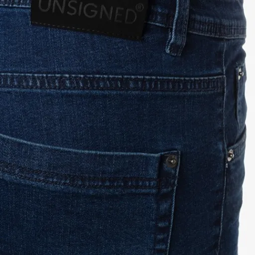 Donkerblauwe Unsigned comfort stretch fit jeans voor heren in lengtemaat 34. Voorzien van een knoop- en ritssluiting, riemlusjes in de boord en twee voor- en achterzakken. De jeans heeft een stone washed uiterlijk en is gemaakt van 99% katoen en 1% elastaan.
