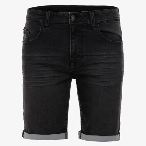 Zwart denim short voor heren van Unsigned. Voorzien van een knoop- en ritssluiting, riemlusjes in de boord en twee voor- en achterzakken. De korte spijkerbroek heeft een wassing en omslag bij de broekspijpen. Gemaakt van 77% katoen, 22% polyester en 1% elastaan.