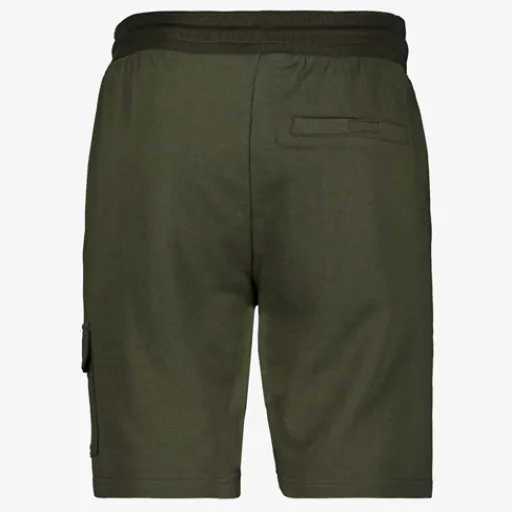 Groene sweatshort voor heren. Voorzien van een elastische tailleband met aantrekkoordjes en twee steekzakken. De sweatshort heeft een klepzak op het bovenbeen en is gemaakt van 100% katoen.