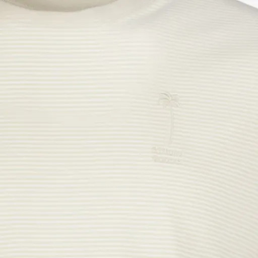 Beige heren T-shirt met subtiele strepen van Unsigned. Voorzien van een hoge, ronde hals en korte mouwen. Het shirt heeft een opdruk van een palmboompje op de borst en is gemaakt van 100% katoen.