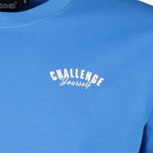 Blauw heren T-shirt van Unsigned. Het shirt heeft korte mouwen, een ronde hals, een tekstopdruk op de borst en een grote backprint. Gemaakt van 100% katoen.